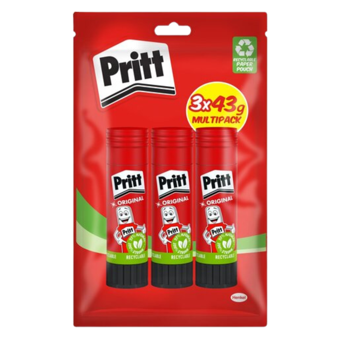 Get creative and stay mess-free with the original Pritt Glue Stick. This value 3-pack of 43g Pritt glue sticks delivers strong, long-lasting adhesion for paper, cardboard, and photos – perfect for school, home, or office use.